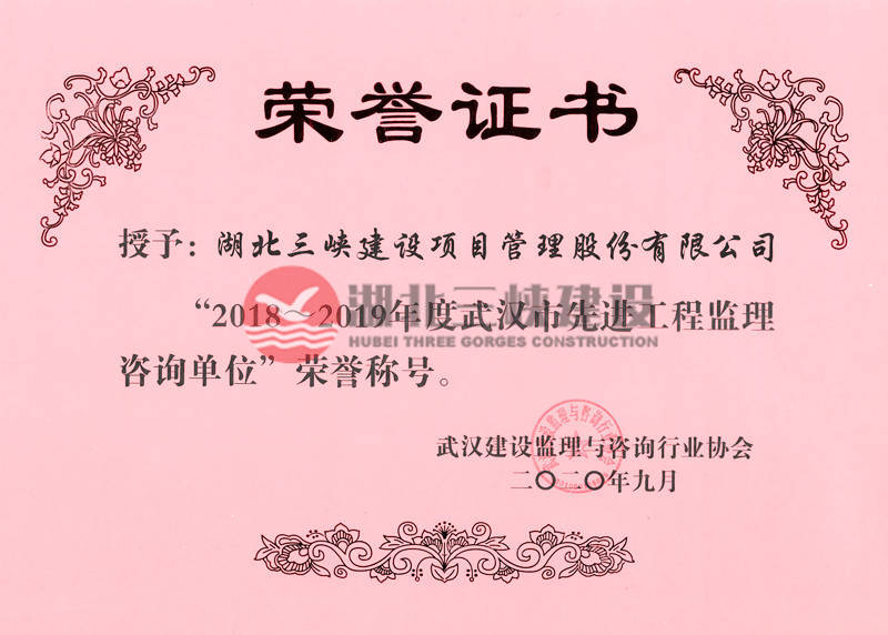 | “2018~2019年度武漢市先進(jìn)工程監(jiān)理咨詢單位”榮譽(yù)稱號 |