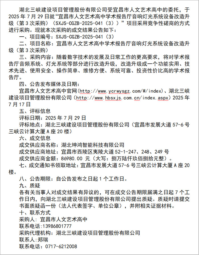 | 宜昌市人文藝術(shù)高中學(xué)術(shù)報(bào)告廳音響燈光系統(tǒng)設(shè)備改造升級(jí)(第3次采購(gòu))成交結(jié)果公告 |